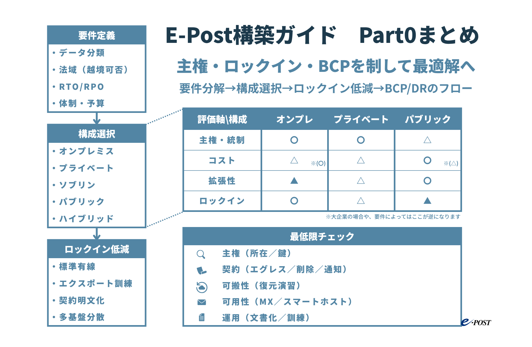 標準技術優先(IMAP/SMTP、DKIM/DMARC 等)/定期エクスポート&復元演習/マルチ基盤分散/契約でエグレス費・保持期間を明文化。