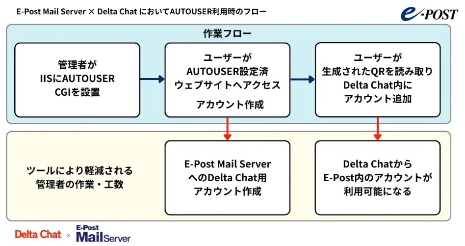 AUTOUSER体験サイトご案内ここでは E-Post Mail Server (x64)が導入された環境がなくても、スマホかPCに Delta Chat をインストールしていれば試用できる AUTOUSER 体験サイトをご案内します。AUTOUSERの機能と役割 AUTOUSERは、E-Post Mail Server (x64)と Delta Chat 組み合わせ時に、Delta Chat 使用時に参加用アカウントを登録しやすくするため、E-Postアカウントの自動作成とQRコード生成を行ってくれるCGIプログラムの便利ツールです。以下は AUTOUSER 利用時のフローです。ご試用環境と操作 スマホかPCに Delta Chat を既にインストールしていただいていることが必要です。PCを使うときにはQRコードを読み取るためのカメラが付属していることが必要です。ご試用期限 AUTOUSER 体験サイトで作成された Delta Chat 用アカウントは10日間ご試用いただけます。自動作成されるアカウントのドメインは「chat.e-postinc.jp」固定です。10日間を過ぎたらメールサーバから自動削除されますのでご留意ください。試用期間を過ぎた Delta Chat 側に登録されたアカウントは自動では削除されませんので、 Delta Chat を操作し手動で削除してください。ご試用目的 E-Post Mail Server (x64) と Delta Chat との組み合わせ時に Delta Chat 参加用アカウントを登録しやすくする AUTOUSER をご試用いただくことが目的です。作成された2つのアカウントで互いに送信することにより内部チャットを体験していただくことができるほか、一般外部のメールアドレスに送信することによって Delta Chat から外部メールアドレスへの送信、外部メールアドレスから Delta Chat への受信をお試しいただけます。作成されたアカウントから、Delta Chat を使って一般外部メールアドレス宛に送った場合、迷惑メールに分類されるケースがありますので、試すときには迷惑メールフォルダ内も確認するようにしてください。Delta Chat ダウンロード Delta Chat アプリはこちら(公式サイト)からダウンロードしてください。E-Post Mail Server (x64) 評価版・[AUTOUSER] ダウンロード 体験サイトで確認された後、E-Post Mail Server (x64) 評価版や AUTOUSER をダウンロードして、実際にWindows Serverにインストールして構築したい場合、公開ダウンロードページにある次のリンク E-Post Mail Server (x64) 評価版、AUTOUSER をそれぞれたどってダウンロードしてください。 |