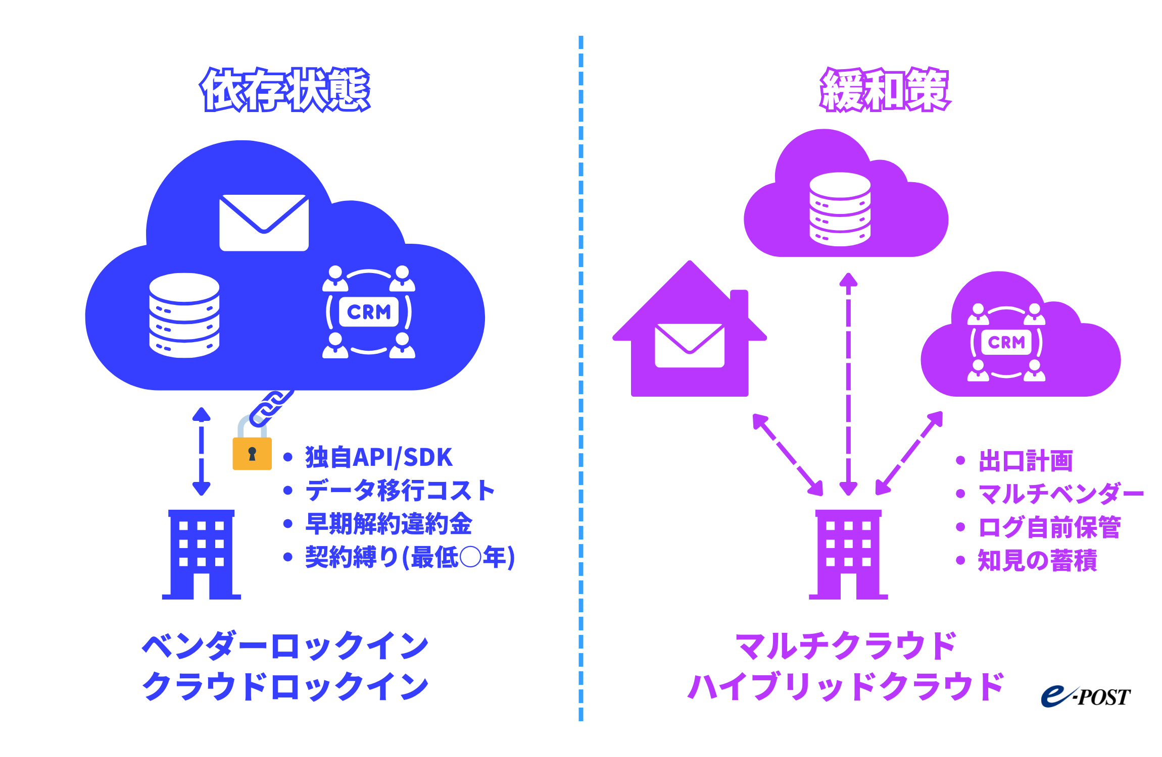 導入形態の選定だけでなく、運用開始後に直面しうるロックイン(乗り換え困難)のリスクを事前に把握しておくことは、メールシステムの重要な検討事項です。特にクラウド活用が一般化した現在、クラウドロックインは将来のIT戦略に大きく影響します。